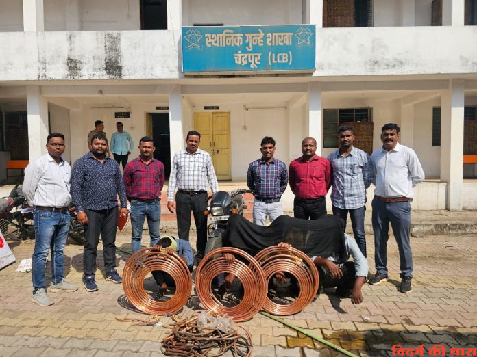 5 मई 2025 को जिला अपराध शाखा चंद्रपुर के उपविभाग चंद्रपुर दल के अधिकारी और कर्मचारी ने जिला पुलिस अधिक्षक मुम्मका सदुर्शन के मार्गदर्शन में साथ ही अपराध शाखा पुलिस निरीक्षक अमोल काचोरे के नेतृत्व में अवैध धंदो पर कारवाई की मुहिम शुरू की है। इस मुहिम में घरफोडी, चोरी करने वाले अज्ञात आरोपीयों का पता लगाने के लिए पेट्रोलिंग दरम्यान गुप्त जानकारी प्राप्त हुई। जिस में रेकार्ड के अपराधी गोलु उर्फ सुमोहीत मेश्राम रा. अष्टभूजा वार्ड अपने साथीदार के साथ नये मेडीकल कॉलेज में शुरू बांधकाम में आक्सीजन आउटलेट कॉपर पाईप की चोरी कर अपने घर में रखने की जानकारी मिली। जानकारी के आधार पर पुलिस ने गोलु मेश्राम और साथीदारों को हिरासत में लेकर पुछताछ करने पर आक्सीजन आउटलेट कॉपर पाईप और अपराध में प्रयोग मोटरसायकल ऐसा कुल 1 लाख 75 हजार का मुद्देमाल जप्त किया है। रामनगर पुलिस स्टेशन में आरोपी गोलु उर्फ सुमोहीत मेश्राम रा. अष्टभूजा वार्ड, राहुल रतन रॉय रा. आजाद चौक, सुंदरम संजय तिवारी रा. अष्टभूजा वार्ड और कमलेश दादुभाई गुप्ता के विरोध में मामला दर्ज कर मामले की जांच रामनगर पुलिस स्टेशन अधिकारी कर रहे है।