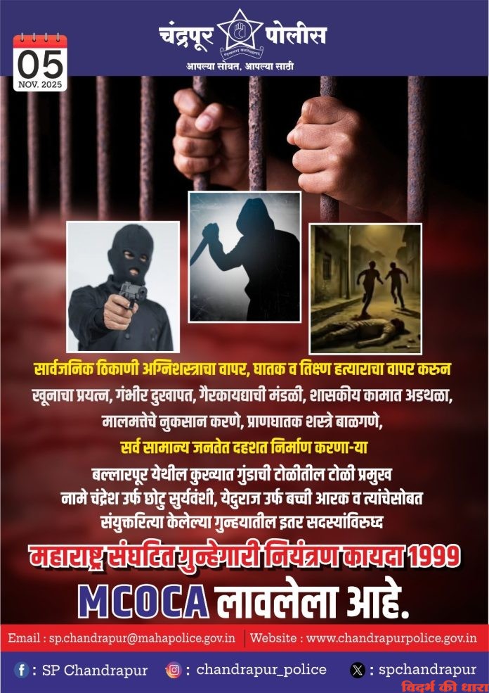 चंद्रपुर जिले के विविध पुलिस स्टेशन क्षेत्र में सार्वजनीक स्थलों पर अग्नि शस्त्र का उपयोग कर, घातक व धारदार हथीयार का प्रयोग कर हत्या का प्रयास, गंभीर जख्मी गैर कानुनी मंडली, वसुली, शासकीय कार्य में बाधा लाना, मालमत्ता का नुकसान कर आम जनता में दहशत निर्माण करने वाले अनेक अपराध दर्ज बल्लारपुर के कुख्यात गुंडो की टोली के टोली प्रमुख चंद्रेश उर्फ छोटू देशराज सुर्यवंशी, येदुराज उर्फ बच्ची रामनरेश आरक व अन्य साथीदारों ने संयुक्त रूप से किए अपराध के सदस्य के विरोध में चंद्रपुर शहर पुलिस स्टेशन में दर्ज अपराध में महाराष्ट्र संघटीत अपराध नियंत्रण कानुन 1999 मोक्का की कलम लगायी गयी है। हाल ही में शहर पुलिस स्टेशन क्षेत्र में पुलिस को गुप्त जानकारी मिलने पर 20 अक्टूबर 2025 को इस सदस्य की टोली को गंज वार्ड चंद्रपुर में 2 माउजर गन, 2 देशी कट्टे, 35 जिंदा काडतुस, 4 लोहे के खंजर जैसे हथीयार के साथ डाका डालने के लिए जाने का पता चलने से उनके विरोध में चंद्रपुर शहर पुलिस स्टेशन में अपराध क्रमांक 758/2025 में कलम 3, 4/25 भारतीय हथीयार कानुन और कलम 310(4) भारतीय न्याय संहीता तहत मामला दर्ज किया गया। इस मामले की जांच में यह टोली डाका डाल कर पैसा प्राप्त कर खुन जैसे गंभीर अपराध करने की तैयारी में होने का पाया गया है।