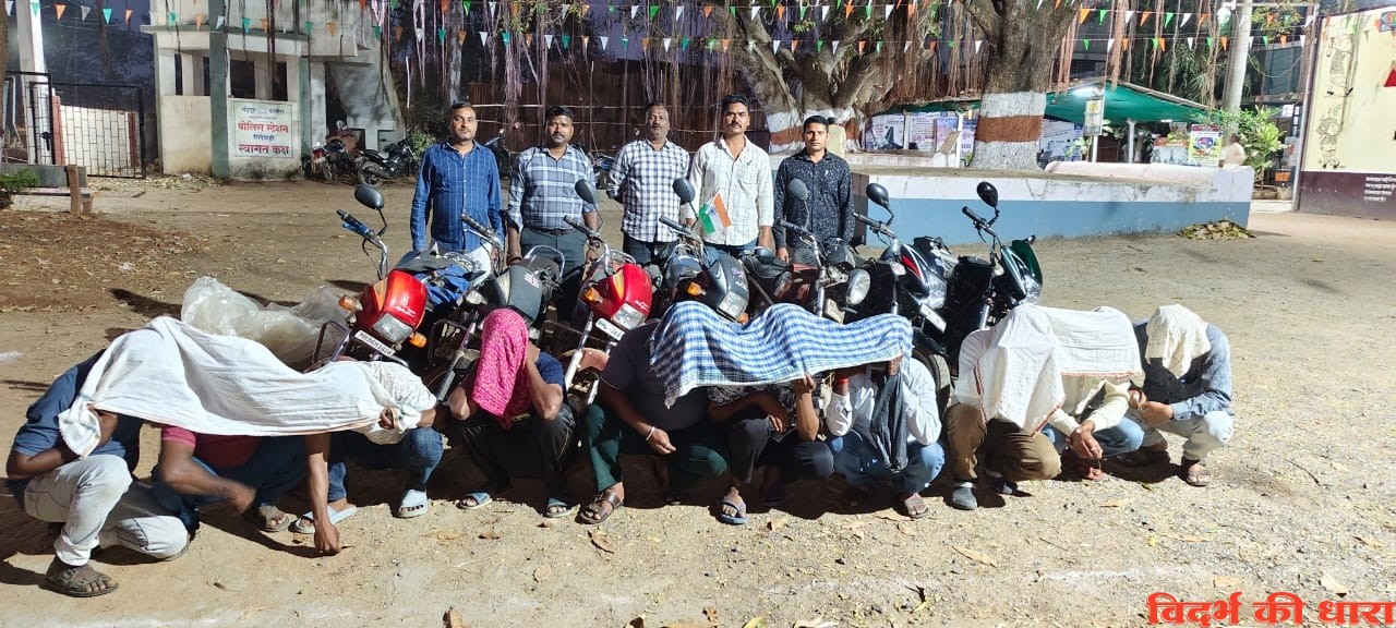 चंद्रपुर जिले में अवैध धंदो, जुए अड्डो पर कारवाई के आदेश जिला पुलिस अधिक्षक मुम्मका सुदर्शन ने जारी किए है। इस अनुषंग से जिला अपराध शाखा दल 3 फरवरी 2026 को सिंदेवाही पुलिस स्टेशन अंतर्गत पेट्रोलिंग कर रहा था। इसी दरम्यान सिंदेवाही पुलिस स्टेशन अंतर्गत 52 पत्तो पर बाजी लगाकर हार जीत का जुआ चलने की गुप्त जानकारी दल को मिली थी। जानकारी के आधार पर दल ने छापा मार कर कारवाई की है। जिस में सिंदेवाही पुलिस स्टेशन में अपराध क्रमांक 116/2026 में कलम 12(अ) जुआ कानुन तहत मामला दर्ज किया गया है। इस कारवाई में नगद 20 हजार 700, आरोपीयों की 7 मोटरसायकल कुल किमत 2 लाख 7 हजार 750 मुद्देमाल जप्त किया है। इस कारवाई में आरोपी सलिम चांदखान पठान 30, दिप रत्न अंबादास खोब्रागडे, जावेद कादरखान पठान, अरूण प्रभाकर नन्नावरे, संतोष तुळशीराम नान्हे, पांडुरंग देवाजी पुसतोडे, पुरूषोत्तम मणीराम बांबोडे, प्रकाश कवडु आदे, सारंग जगन्नाथ निमगडे, जितेंद्र महादेव करकाडे, सभी रा. सिंदेवाही को गिरफ्तार कर आरोपी निखिलराऊत रा. नांदेड तह नागभीड और मोटर सायकल क्रमांक एमएच 34 ई 7952 के चालक का पता लगाना शुरू होकर मामले की जांच सिंदेवाही पुलिस कर रही है।