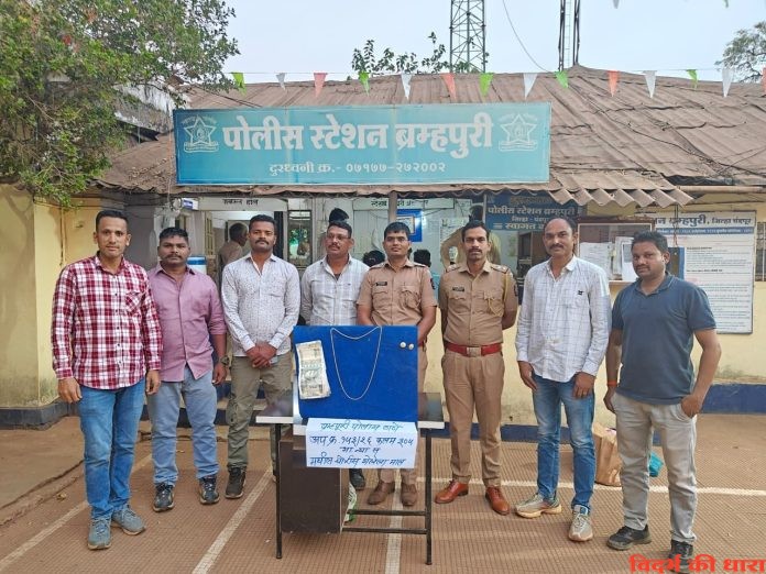 5 फरवरी 2026 को ब्रम्हपुरी पुलिस स्टेशन में शिला रूषी मानकर 50 ने शिकायत दर्ज करायी थी। जिस में 4 फरवरी को दोपहर 12 बजे किसी अज्ञात चोर ने घर में घुस कर कुकर में रखे 10 ग्राम के सोने का गोप व 2 कान की जोडी साथ ही नगद रक्कम की चोरी की है। शिकायत के आधार पर ब्रम्हपुरी पुलिस स्टेशन में अपराध क्रमांक 153/2026 में कलम 305 भारतीय न्याय संहिता 2023 तहत मामला दर्ज किया गया है। इस मामले की जांच में आरोपी व चोरी किया गया माल का पता लगाने के लिए सपोनी खडसे व डीबी दल ने परिसर में जांच मुहिम शुरू की। जिस में कुछ महिला बाहर गांव से सर्कस का खेल दिखाने के लिए आने की गुप्त जानकारी मिली। साथ ही महिलाए घर में चावल खाने की वस्तु मांगने के लिए घूमने और उन्ही महिलाओं ने शिला मानकर के घर में चोरी करने की जानकारी मिली थी। जानकारी के आधार पर नागभीड से ब्रम्हपुरी मार्ग की खुली भूमी पर डेरा डाल कर बैठने की जानकारी पर चंदा सिंकदर सैय्यद 40 रा. दरेगांव जिला नाशिक और मदीना अलताफ शेख 30 रा. दरेगांव जिला नाशिक को पुलिस दल व महिला कर्मचारी ने हिरासत में लेकर पुछताछ की। इस पुछताछ में 1 लाख 50 हजार किमत का 10 ग्राम वजन का गोप, 45 हजार किमत का 3.250 ग्राम टॉप, 4 हजार नगद, 1 हजार किमत का जर्मन का कुकर ऐसा कुल 2 लाख का मुद्देमाल जप्त किया गया है। मामले की जांच ब्रम्हपुरी पुलिस स्टेशन पुलिस निरीक्षक प्रमोद बानबले के मार्गदर्शन में की जा रही है।